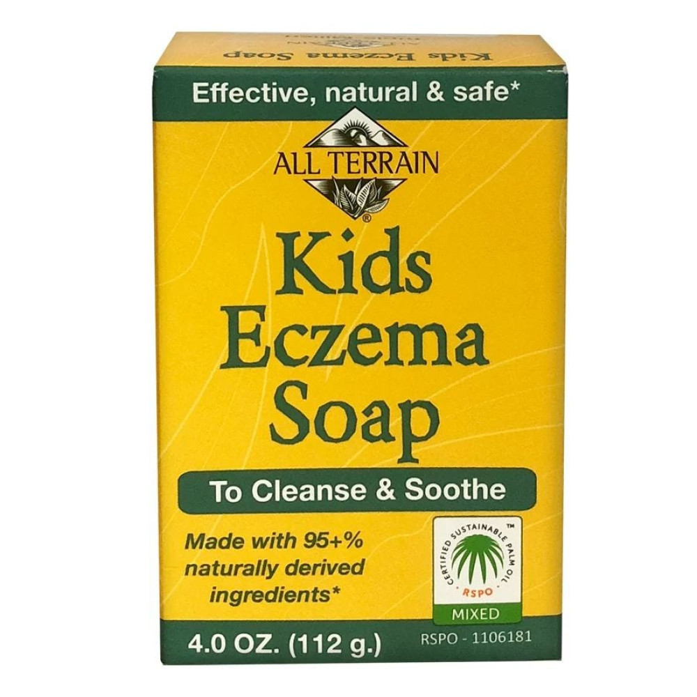 It is hard to see when your loved one is dealing with pain, itch and all the other physical aspects of eczema. All Terrain's Kids Eczema Soap is specially formulated to help cleanse, calm and soothe kids' itchy, irritated skin due atopic dermatitis or eczema. Environmentally-friendly Kids Eczema Soap is made with 95+% naturally derived ingredients, such as neem oil, tea tree oil, soybean oil, sunflower oil, plantain extract, oat extract, rosemary extract and RSPO certified palm oil to cleanse and calm eczema affected skin.
