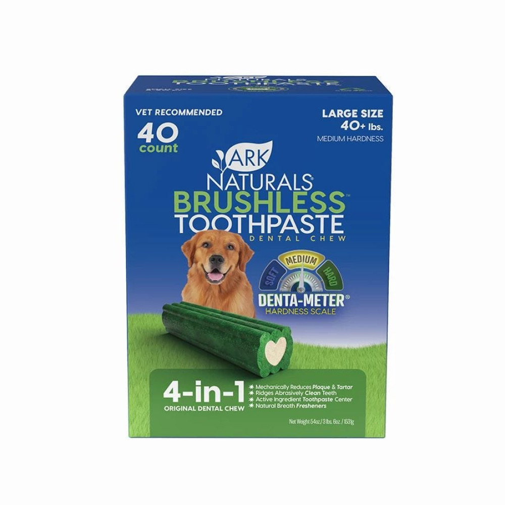 Value Pack Large in Stock with a 30% value! Parents and their pets everywhere love Ark Naturals tried-and-true brilliant formulas. Their 4-in-1 Brushless Toothpaste dental dog chews do more than freshen breath (which they definitely do). They have a unique toothpaste center, surrounded by a harder outside layer to abrasively clean teeth and mechanically help reduce plaque and tartar buildup. Not to mention, they are packed with wholesome, human grade ingredients that are low calorie and easy to digest. Treat your teeth twice a day, just like your human brushes their teeth!