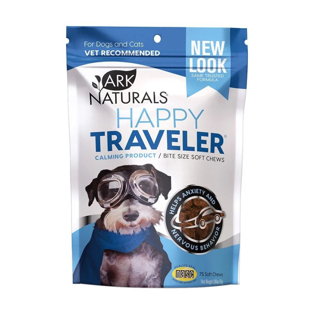 The world can be a scary place for a pup! Add Ark Naturals' natural herbal calming formula to any stressful situation and watch the worry wash away. Ark Naturals' Happy Traveler® soft chews help ease motion sickness during long car rides or jet setting around. Made with four powerful calming ingredients, we guarantee one Happy Traveler.