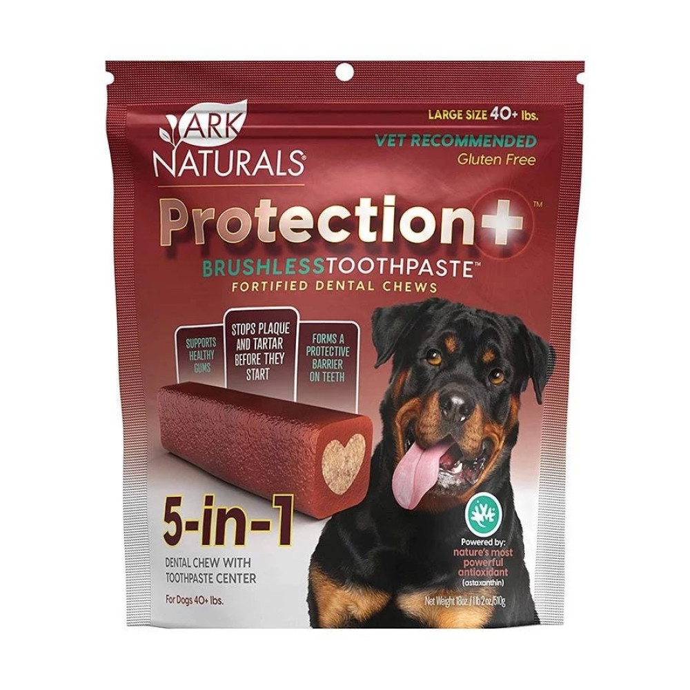 Protection+ Brushless Toothpaste is the only dental chew that stops plaque and tartar before they start! Powered by nature's most powerful antioxidant: Astaxanthin! Astaxanthin stops plaque and tartar before it can even start by boosting the antibody immunoglobulin A (lgA) in the saliva, therefore creating a protective barrier on teeth! Ark Naturals unique 5-in-1 dental chews have a toothpaste center with active ingredients and natural breath fresheners such as cinnamon, clove and vanilla. Their dental chews also support gums with antioxidant power and form a protective barrier to support healthy teeth.