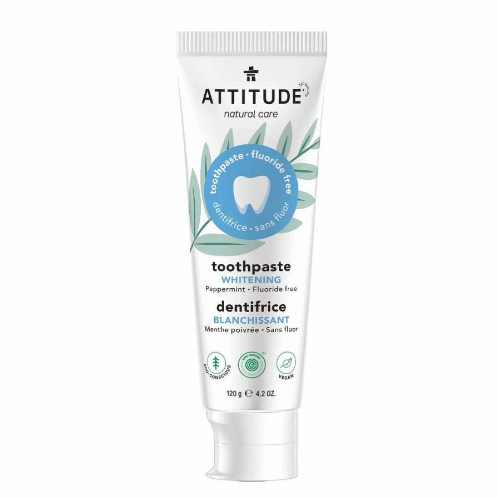 Reveal your whitest smile with ATTITUDE's Fluoride Free Adult Toothpaste Whitening. Paraben- and alcohol-free, this whitening toothpaste's key ingredient is hydroxyapatite, a gentle whitening agent that won't irritate your gums or your enamel. EWG VERIFIED™?, fluoride-free and vegan, it will reveal bright smiles. Plus, it comes in a tube and no unnecessary packaging cardboard box, a more sustainable alternative to traditional toothpaste. Gentle enough to use morning, night, and after every meal so brush away to reveal sparkling clean teeth!
