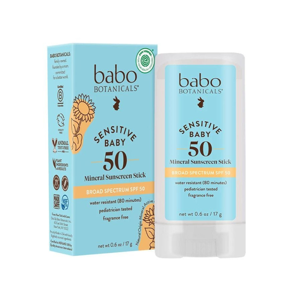 Gentle baby sunscreen stick you can trust! The Sensitive Baby Mineral Sunscreen Stick is essential in protecting your little one's delicate skin from the sun's harmful UVA and UVB rays. This convenient baby sunscreen stick is water resistant and created with natural origin mineral zinc oxide for effective broad spectrum SPF50 protection for face & body. Made with 17 plant-based ingredients including nourishing shea butter. This SPF formula is one of the first-ever sunscreens to be EWG Verified® to ensure the highest level of safety and quality. You can feel good using this fragrance-free baby sunscreen stick on your little one.