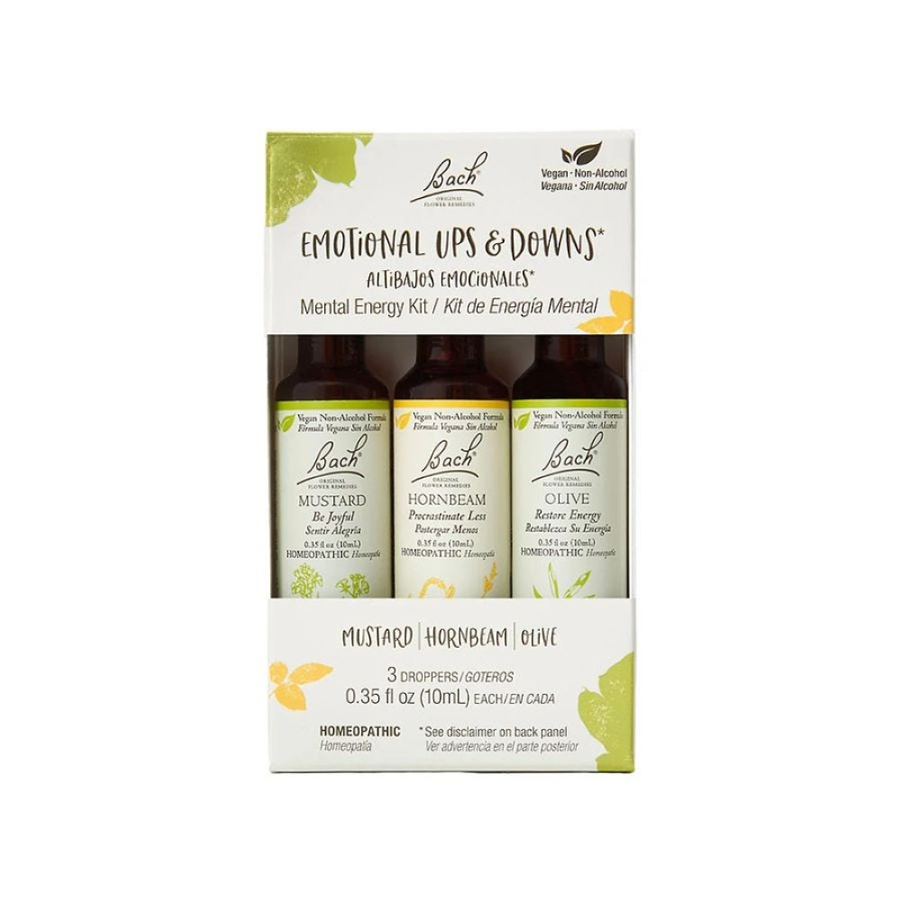 Balance emotional ups and downs. Restore your mental energy. Navigate through life's emotional ups and downs with this latest mental energy kit, now available in a 10ml non-alcohol formula, with convenient bilingual English and Spanish packaging. A safe and gentle solution that's suitable for the whole family during emotionally demanding situations. This mental energy kit contains (3) 10mL Bach Original Flower Remedies: Mustard: brings back joy and cheerfulness when sudden gloom descends for no obvious reason. Hornbeam: helps restore energy to face the task ahead when procrastinating or feeling mentally weary. Olive: helps restore energy when feeling physically and mentally exhausted.