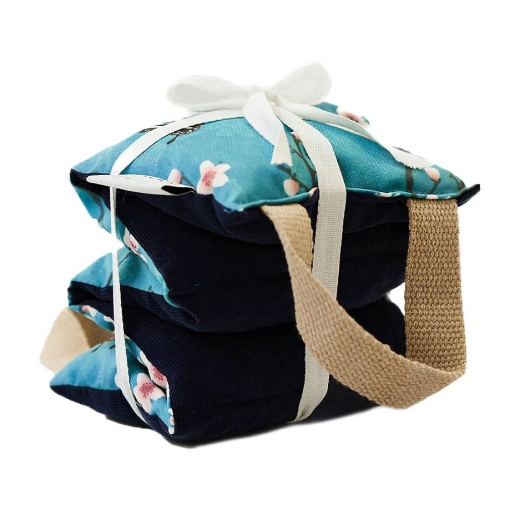 This therapeutic pillow is wrapped in a teal cherry blossom cotton fabric and backed with cozy navy corduroy, ensuring a soft touch when you need it most. Suitable for hot and cold treatment anywhere on the body to release tension and soothe muscle aches. Filled with naturally cleaned cherry stones that are a by-product of domestic cherry farming. Natural fiber handles are sewn into the ends for ease of use. Each handmade cherry stone pillow measures 5.5" x 20"