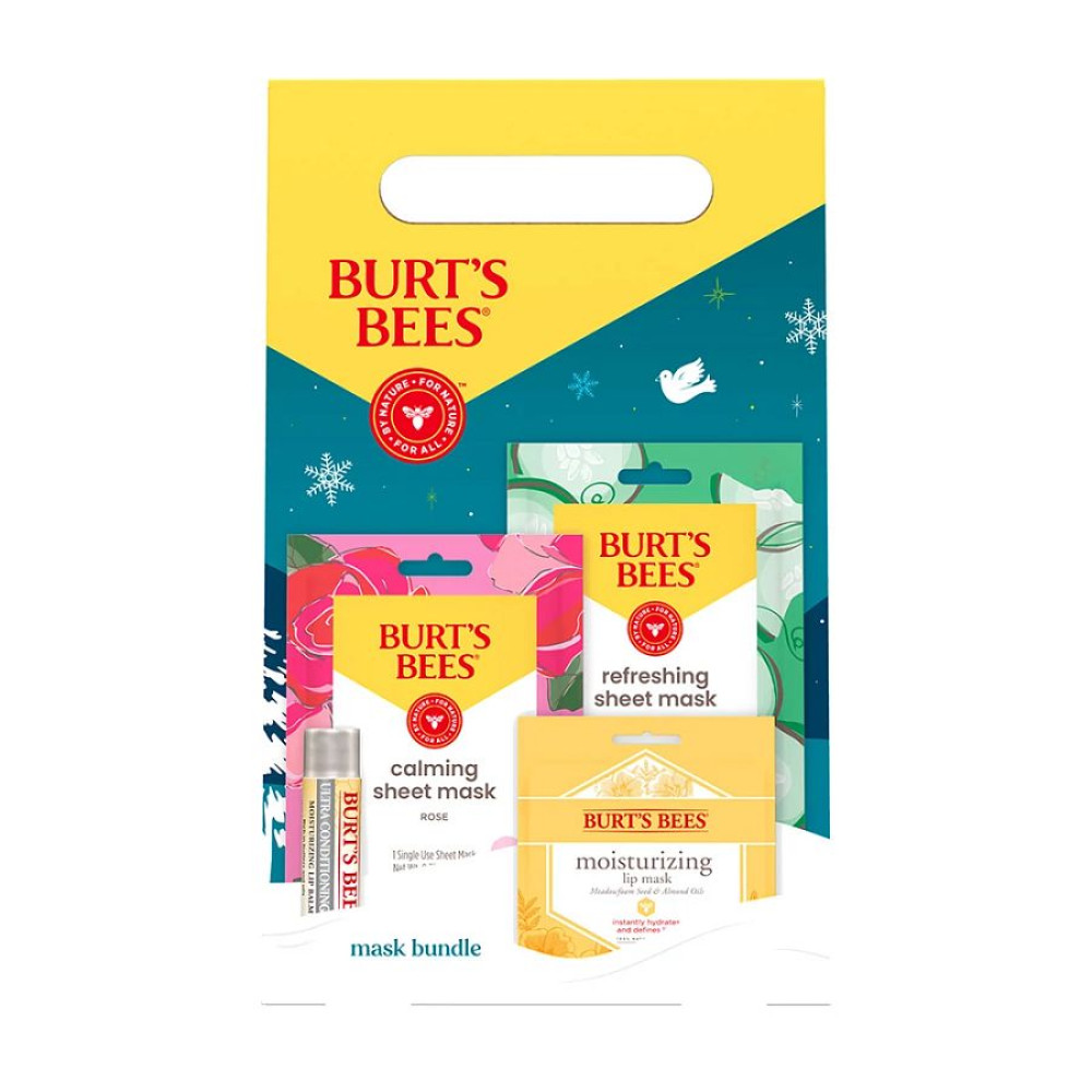 Unwrap a little joy this holiday season with this Burt's Bees Mask Bundle Gift Set. Instantly hydrate and define your lips with the lip mask, formulated with a blend of clean ingredients like meadowfoam seed and almond oils. Infused with nature's finest ingredients, including kokum butter, shea butter and antioxidant-rich marula oil, the Ultra Conditioning Lip Balm melts on your lips, leaving them soft and smooth. The Refreshing Sheet Mask with Cucumber moisturizes, refreshes and awakens skin, while the Calming Sheet Mask with Rose helps balance pH for soft, hydrated skin. Formulated without parabens, phthalates, petrolatum or SLS, these natural origin products revitalize and beautify lips and skin with clean ingredients. Each festive holiday gift pack contains two face sheet masks, one lip mask and one tube of lip balm, making them the perfect addition to Christmas gift bags.