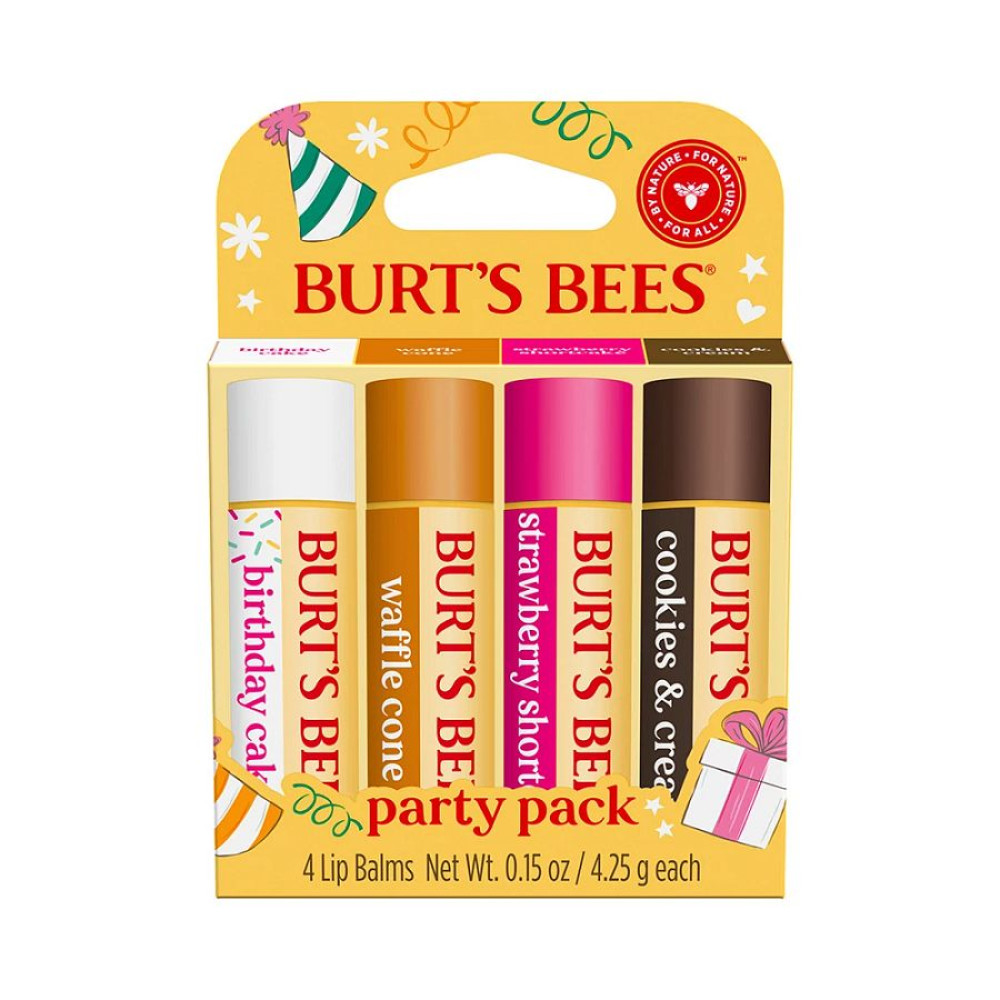 One Burt's Bees Party Pack Lip Balm Gift Set with four 0.15 oz. tubes of natural origin lip balm in Birthday Cake, Waffle Cone, Strawberry Shortcake, and Cookies and Cream. Remember the birthday party flavors of childhood with these fun flavored lip balms, including Birthday Cake, Waffle Cone, Strawberry Shortcake, and Cookies and Cream. The Burt's Bees Party Pack Lip Balm Gift Set is the perfect way to show coworkers, friends and family members you're thinking of them on birthdays and special occasions.