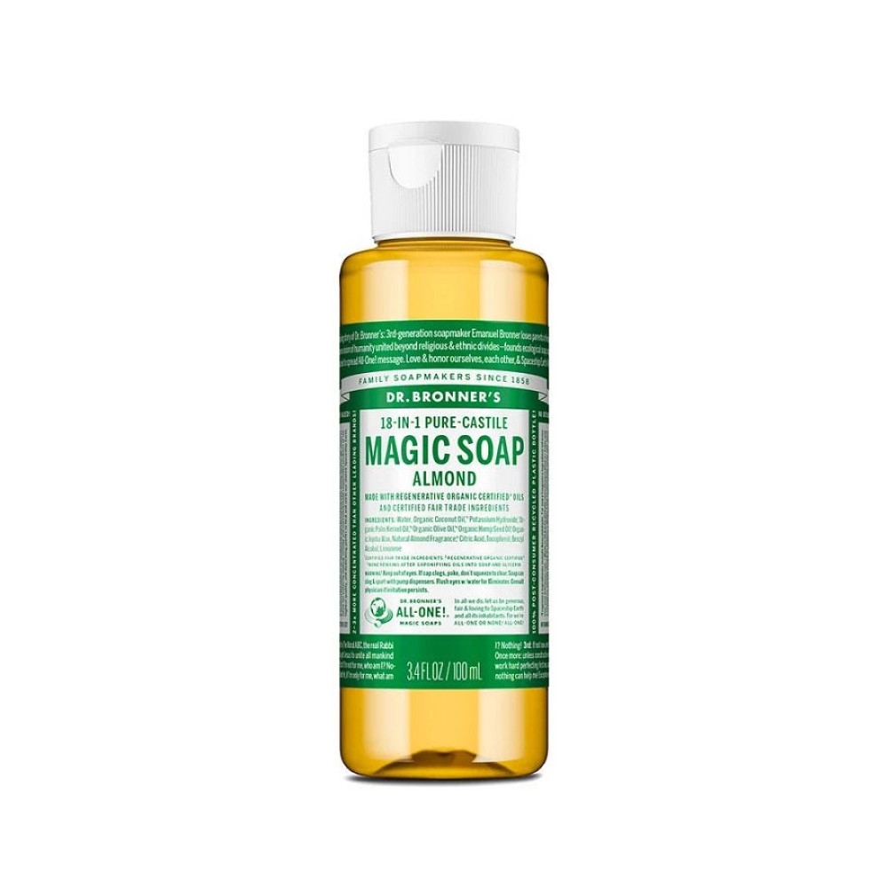 Warm, comforting and slightly sweetlike marzipan or amaretto! This Almond Pure-Castile Liquid Soap is concentrated, versatile, and effective. Made with organic and certified fair-trade ingredients. Now in a travel-friendly 100% post-consumer recycled 3.4 oz bottle. All-One!