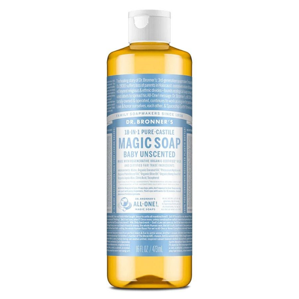 Gentle yet effective, Dr. Bronner's Baby Unscented Liquid Soap is great for sensitive skin. Made with a nourishing blend of Regenerative Organic Certified® oils and double the olive oil, this true soap creates a rich, luxurious lather that rinses clean. Free from added fragrance, it's ideal for babies (when diluted) and anyone sensitive to scents. Crafted with organic, ethically sourced ingredients and no detergents, dyes, or foaming agents. Vegan, made with Organic Oils, Fair Trade, and EWG Verified for a safer, more sustainable cleanfor you and your family! Please note: This product line has a new look. The packaging you receive may vary for a limited time.