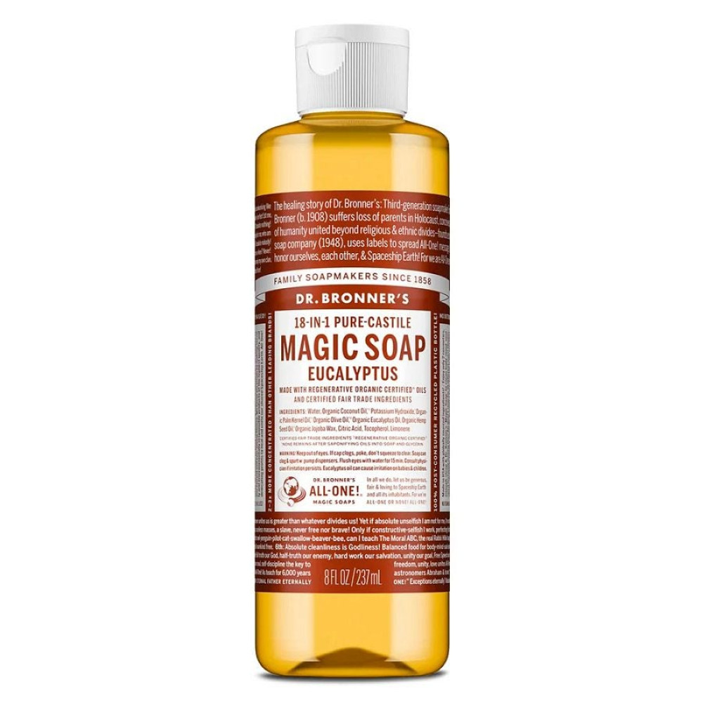 Breathe deep and refresh your senses with Dr. Bronner's Eucalyptus Liquid Soap. Infused with pure eucalyptus essential oil, this true soap renews body and soul leaving you feeling refreshed. Made with Regenerative Organic Certified® oils, it creates a rich, smooth lather that rinses clean. No detergents, dyes, or added foaming agents. Vegan, Made with Organic Oils, and Fair Trade for peace of mind and a clean that's good for you and the planet! Please note: This product line has a new look. The packaging you receive may vary for a limited time.