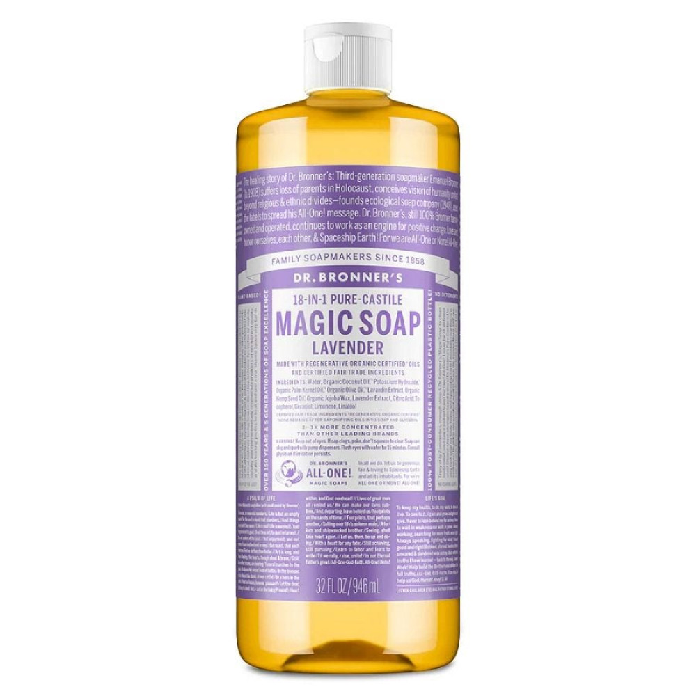 Relax and unwind with the calming scent of Dr. Bronner's Lavender Liquid Soap. Infused with pure French lavender essential oil, this true soap creates a rich, smooth lather that rinses clean. Made with Regenerative Organic Certified® oils, it gently cleanses while leaving behind a soothing, genuine scent. No detergents, dyes, or added foaming agents. Vegan, Made with Organic Oils, Fair Trade, and EWG Verifiedfor a clean that renews body and soul. Please note: This product line has a new look. The packaging you receive may vary for a limited time.