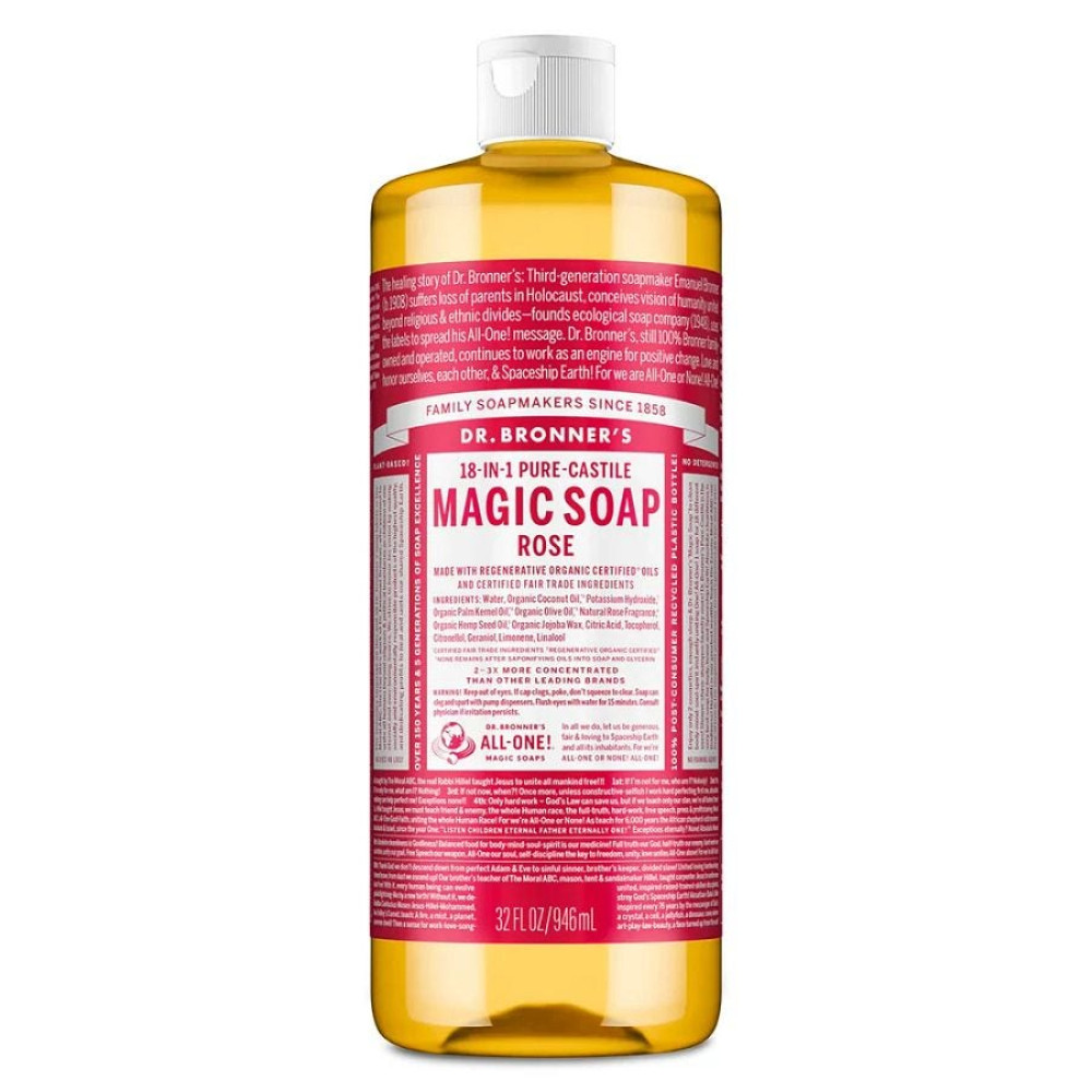 Indulge in the scent of fresh roses with Dr. Bronner's Rose Liquid Soap. This true soap is infused with a high concentration of naturally derived rose fragrance, leaving skin feeling soft and delicately scented. Made with Regenerative Organic Certified® oils, it creates a rich, luxurious lather that cleans while rinsing clean. Crafted with organic, ethically sourced ingredientsno detergents, dyes, or added foaming agents. Vegan, made with Organic Oils, Fair Trade, and EWG Verifiedshower with trust! Please note: This product line has a new look. The packaging you receive may vary for a limited time.