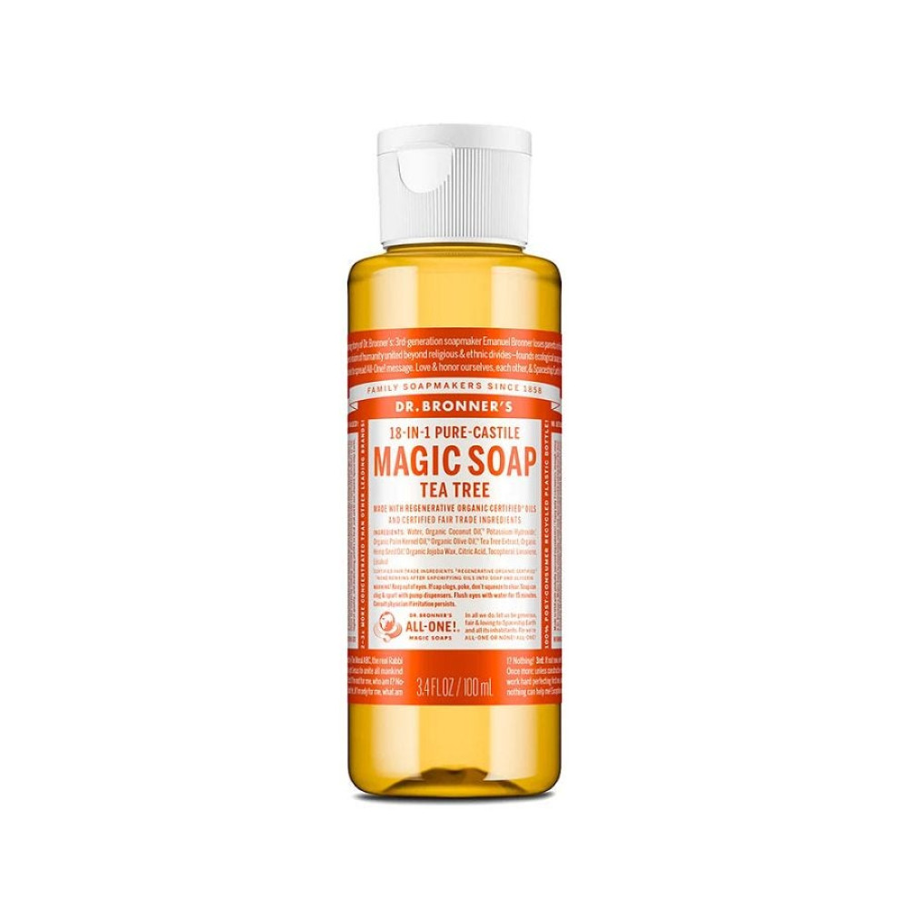 Woodsy and medicinal, this Tea Tree Pure-Castile Liquid Soap contains pure tea tree oilgood for acne-prone skin and dandruff! Dr. Bronner's soap is concentrated, versatile and effective. Made with organic and certified fair-trade ingredients. Now in a travel-friendly 100% post-consumer recycled 3.4 oz bottle. All-One!