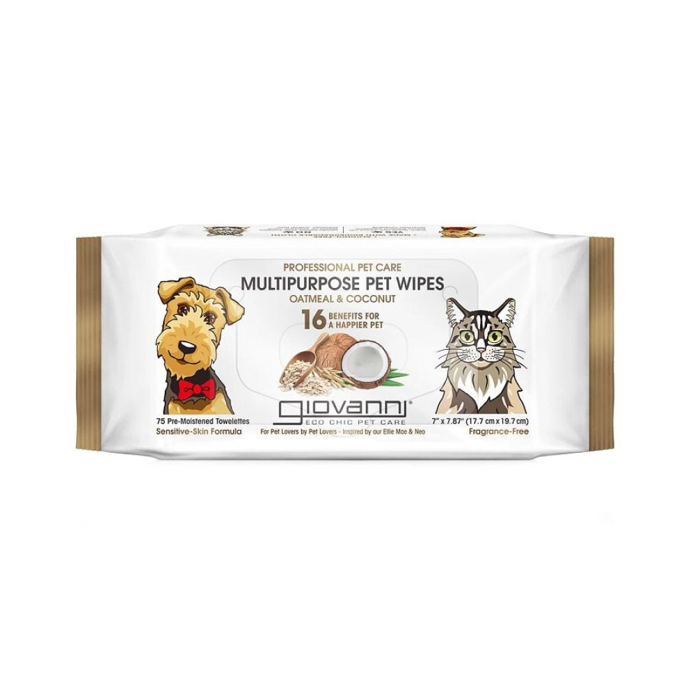 When your pet is ruff around the edges and needs a quick cleanup, touch up your pure-bred, mutt or holy terrier with Giovanni's Multipurpose Pet Wipes to keep your furry friend looking pawfessional. Leaves pets feeling so clean and shiny that even the paparazzi will roll over. Oatmeal cleanses coat & helps normalize pH levels, and soothes dry, itchy skin Coconut leaves coat with luster and shine & helps hydrate and protect sensitive skin.
