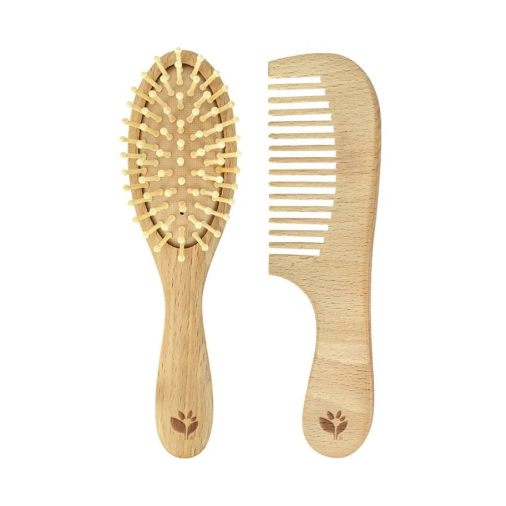 Gently smooth and detangle your little one's hair using our green sprouts® Learning Brush and Comb Set. The soft flexible bamboo bristles on our learning brush easily brush thick or curly hair while still being gentle on scalps. The wooden learning comb has wide teeth to help remove knots from hair without pulling for guaranteed comfort. Our learning grooming set is made from earth-friendly bamboo, silicone, and natural wood without hormone disrupting BPA, BPS, BPF, BFDGE, NOGE, or BADGE additives. For use with adult supervision only and meant to encourage independent brushing during their toddler and younger child stages. Our Learning Brush and Comb Set is compact and lightweight for easy storage at home or on-the-go and makes a sweet and stylish gift set for birthday parties.