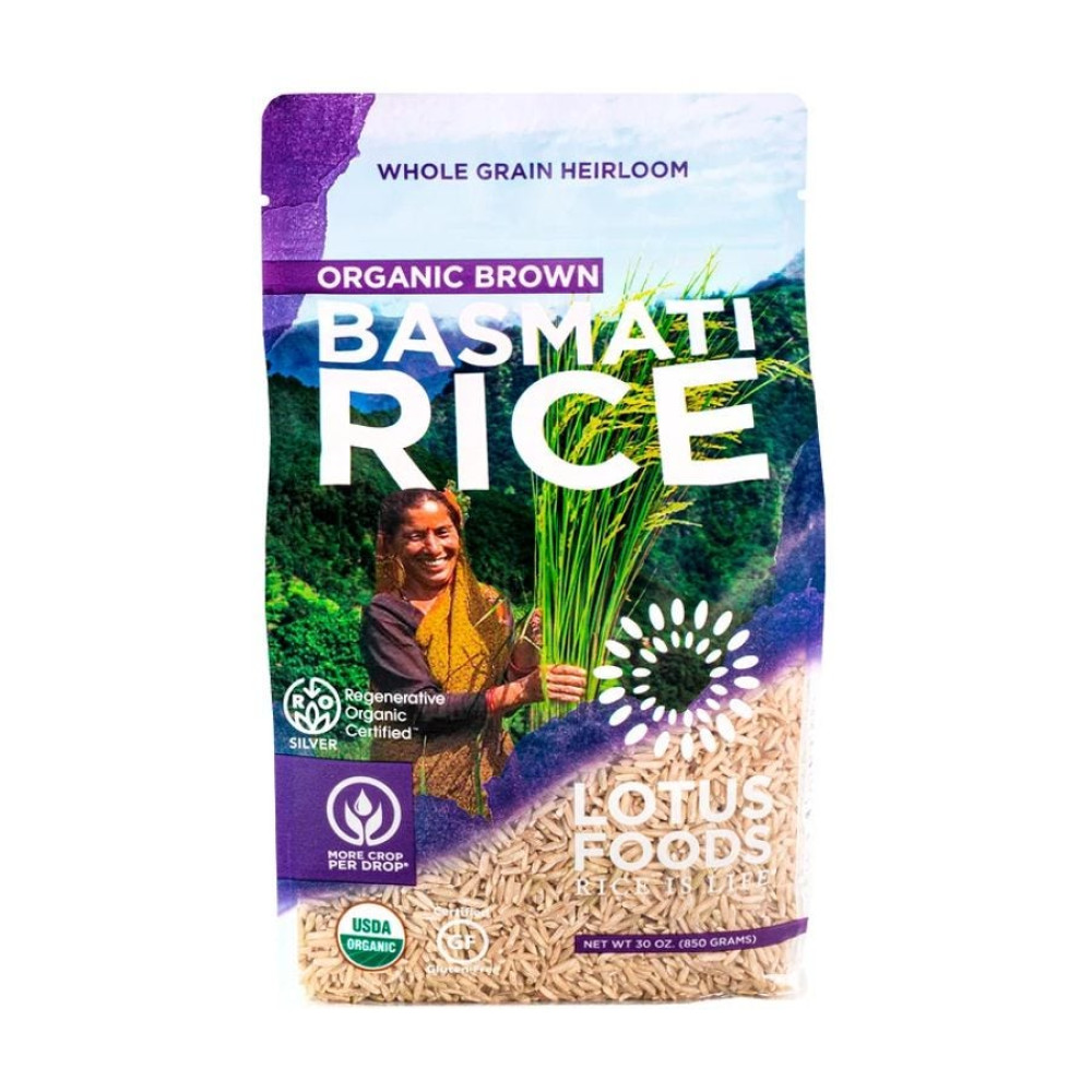 One of the few authentic traditional basmati varieties still in production, Lotus Foods whole grain heirloom basmati is grown on family farms in Northern India. Its exceptional aroma, flavor and texture are what made basmati one of the most beloved rices in the world. It cooks up soft and fluffy in 30 minutes, and is perfect in pilafs, curries, salads, stir-fries, and more. This Basmati Rice is the first Regenerative Organic Certified® (ROC® Gold) Rice. This rigorous new standard promotes farming that enriches rather than degrades soil and values animals and workers.