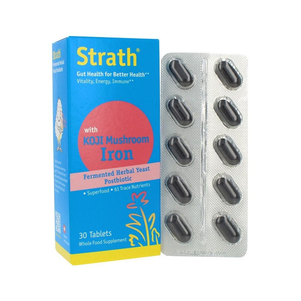 Strath with KOJI Mushroom Iron Tablets harness the power of postbiotics to support gut health and overall wellness. As a postbiotic, Strath works by delivering beneficial metabolites from a unique fermented yeast complex that nourishes the gut microbiome. These bioavailable nutrientsincluding B vitamins, essential amino acids, and trace elementsare quickly absorbed to support digestion, immune function, and energy. Free from artificial additives and preservatives, Strath with KOJI Mushroom Iron Tablets provides an easy, effective way to integrate postbiotic benefits into daily wellness, helping to balance the microbiome and promote long-term gut health. Made with Swiss precision, they're ideal for natural, holistic support. Strath has been making postbiotics before the term "postbiotics" gained popularity.