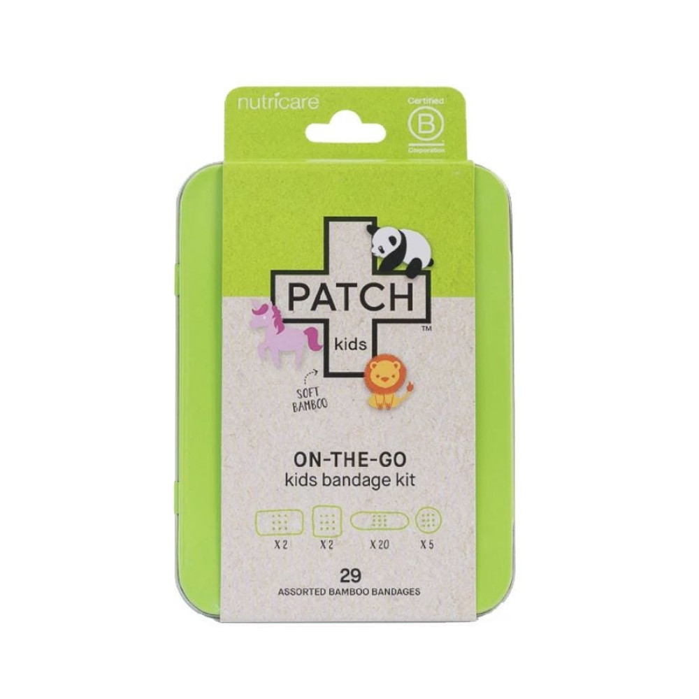 PATCH strips work best applied on clean, dry skin. Clean and dry the area. Apply bandage directly to skin and change daily or as needed. Good news! The outer packaging is 100% curbside recyclable, and the bandages are compostable at home or an industrial compost facility.Content Description | Includes 10 Panda Bandage Strips, 5 Unicorn Bandage Strips, 5 Lion Bandage Strips, 2 Large Square Panda Patches, 2 Large Rectangle Panda Patches and 5 Panda Bandage Dots in a Refillable Patch Travel Tin |