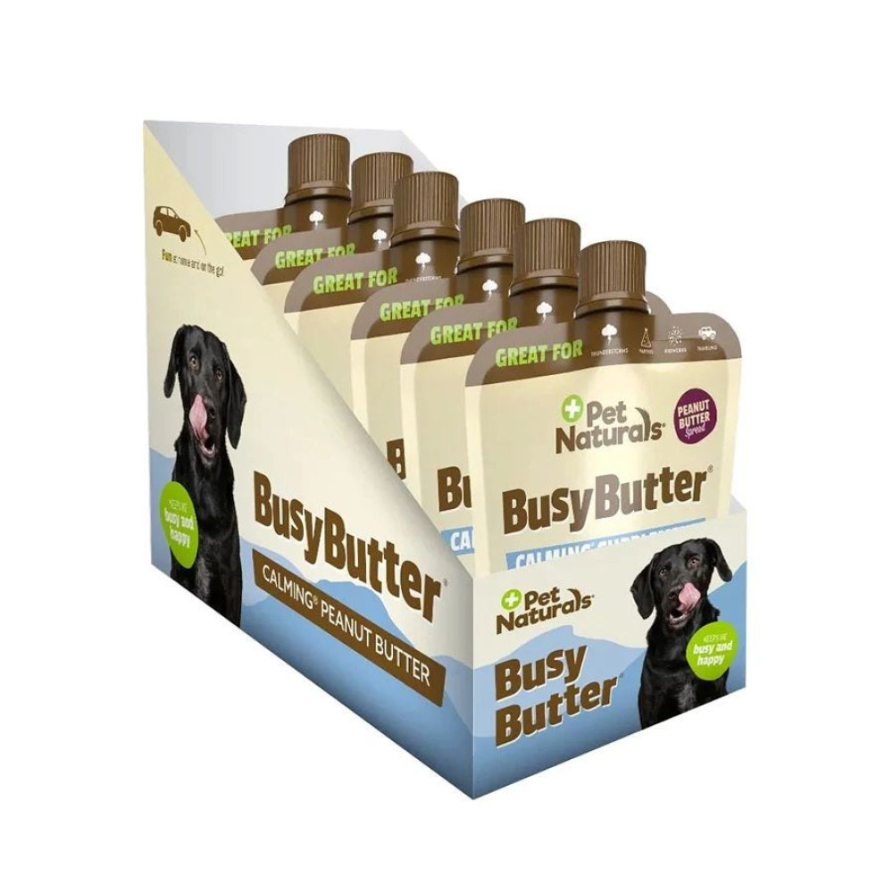 Calming® peanut butter keeps your pupper calm long after they've licked it up! With an easy squeeze pouch, BusyButter® can be added to a fillable toy to keep playtime going at home or on the go.The calming formula features four effective ingredients, including L-theanine and lemon balm combined with pup-approved peanut butter. It's even OK to give your dog an extra serving (or more!) to keep 'em busy and happy! Before opening BusyButter, knead pouch to mix. Some separation of natural peanut oil is expected. Gently squeezing the pouch from the bottom up will re-mix the contents to avoid any spills.