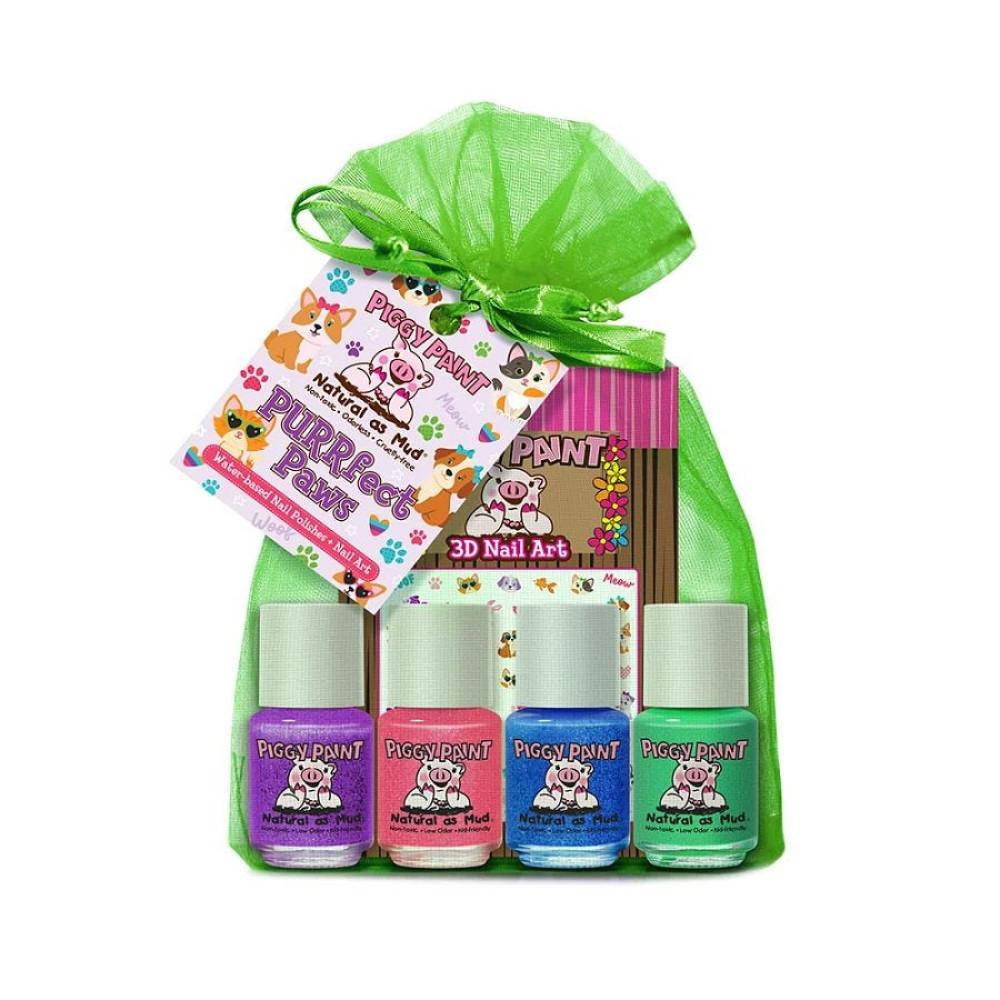 This pet-inspired nail polish set is purr-fect for kids who are crazy about pets! Whether you love dogs, cats, or all animals, these polishes are sure to make your nails paws-itively perfect! Includes 4 mini 0.25 oz. nail polishes (Let's Jam, Light of the Party, Mer-maid in the Shade, Ice Cream Dream) and 'Playful Pets' 3-D Nail Art with cute animal-themed nail stickers. Piggy Paint is ALL the Fun, with NO harsh chemicals! Piggy Paint nail polish is Non-toxic, Virtually Odorless, and Kid-friendly! This Advanced, Water-based formula Dries Hard - and Doesn't Wash or Peel off. Plus, it's Cruelty-free, Vegan, and Safe for all ages! Piggy Paint is a Premium brand that is trusted by parents (& created by a Mom!).