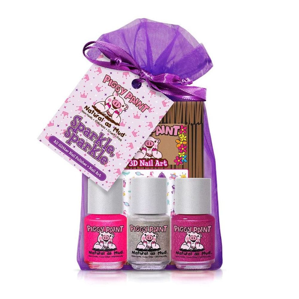 Kids will love this All Sparkle Gift Set with 3 mini 0.25 oz. glitter nail polishes + cute Princess Nail Art! Piggy Paint nail polish is non-toxic, virtually odorless, and kid-friendly! This advanced, water-based formula dries hard - and doesn't wash or peel off. Plus, it's cruelty-free, vegan, and safe for all ages! Piggy Paint is a Premium brand that is trusted by parents (& created by a Mom!). It's time to 'Sparkle, Sparkle' with NO harsh chemicals!