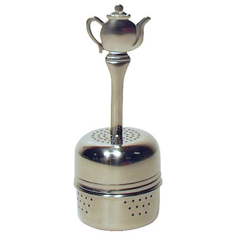 Tea Ball (1 1/4") with teapot handle and stainless steel used to steep tea leaves to desired flavor.