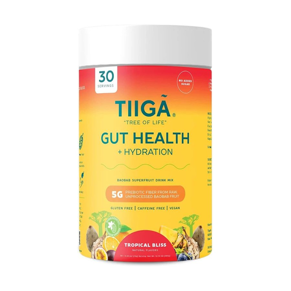 Tiiga makes a gut health + hydration powder drink mix using raw, unprocessed baobab fruit. Baobab fruit grows wild, is naturally powdered, high in potassium and is over 50% prebiotic fiber. They combine this superfruit with electrolytes. It's completely unique in the gut health and fiber space with the added benefit of a hydration drink powder.