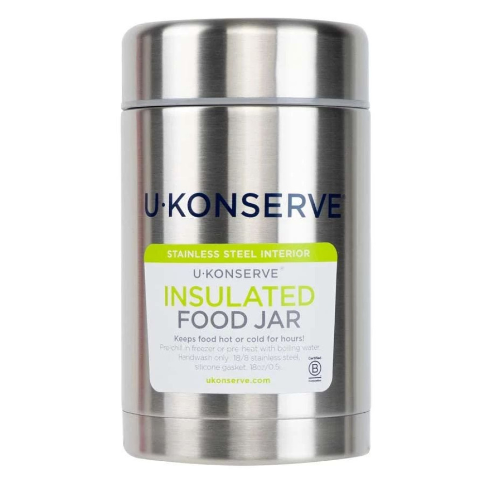 U-Konserve Insulated Food Jar Stainless Steel Container 18oz is leak-proof with an all-stainless, plastic-free interior and keeps food hot or cold for hours! Pack soup or chili in the morning and lunch will be steaming when you are ready to eat. Pack smoothies or yogurt and it stays cool until lunchtime. Take leftovers on-the-go so you can eat healthier and reduce food waste with our double-walled food jars. Similar to a thermos, they keep the temperature you start with, so pre-heat with very hot water for a few minutes before adding piping hot food, and pre-chill in the freezer for a few minutes (lid off) before adding cold food. Our food jars keep pre-heated food hot up to 5 hours, and pre-chilled food cold at least 8 hours. Exterior stays room temperature and condensation-free. Hand wash. 304 (18/8) stainless steel. Lid has silicone seal, and PP#5 inside plastic rim (that does not come in contact with food). Free of BPA, BPS, phthalates and lead. 18oz, 6" x 3.5".