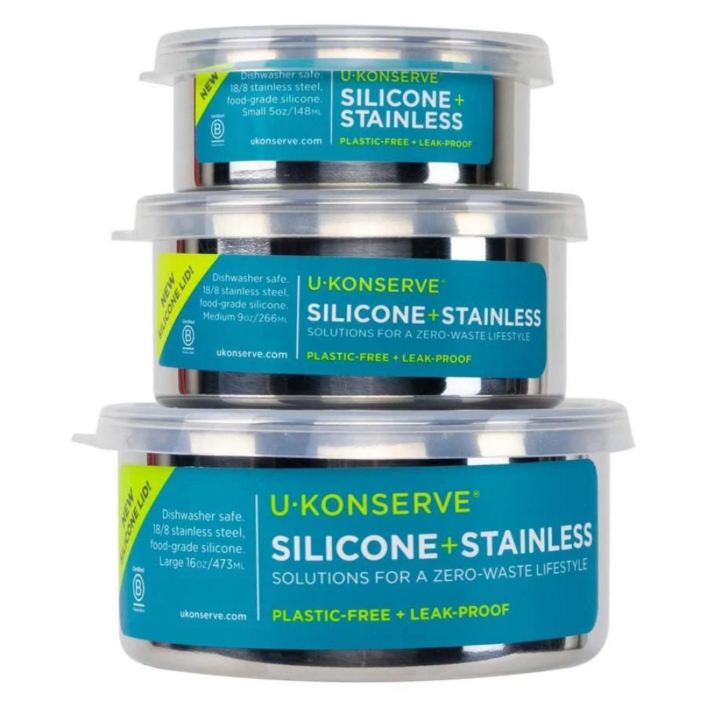 U-Konserve Round Nesting Trio Stainless Steel Container (Set of 3) with Clear Silicone Lids is perfect waste-free solution for kids lunches, picnics, travel, outdoor adventures and bulk shopping. Also ideal for kitchen organization, pantry makeovers, meal prep and family leftovers. Leak-proof lids, etched tare weighs for bulk shopping, dishwasher safe and like-shapes nest for easy storage. The stainless steel nesting set (16oz, 9oz and 5oz) are great for large and small snacks, help reduce single-use packaging, and are versatile enough for many food-storage needs at home and on the go. Flexible silicone lids are easy for little hands to open, and the leak-proof feature keeps spills at bay. Our new non-toxic stainless steel and silicone combination make these lunchboxes the best zero-waste solution for you and the planet. Plastic-free, durable, flexible, platinum-grade silicone. 304 (18/8) stainless steel. Free of BPA, BPS, phthalates and lead. 5oz container: 3.5" x 1.5" (lid fits all U-Konserve 5oz round containers), 9oz container: 4" x 2" (lid fits all U-Konserve 9oz round containers), 16oz container: 4.75" x 2.25".