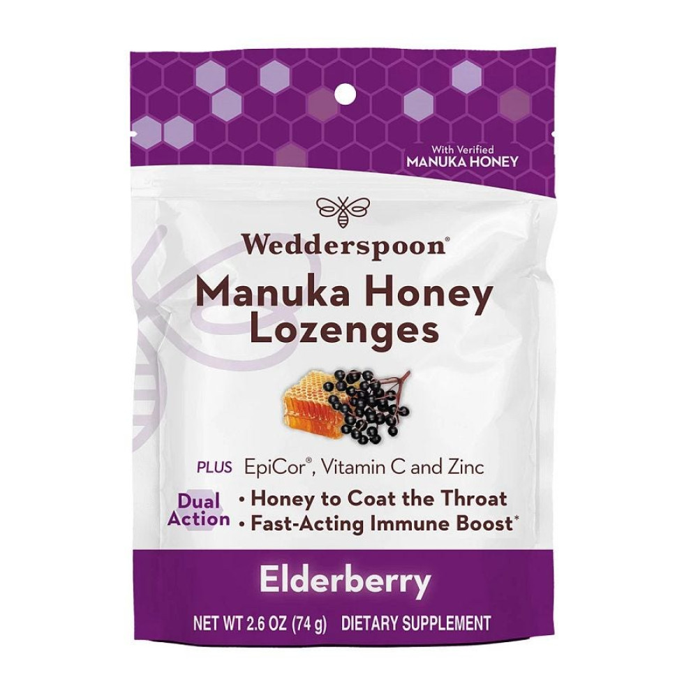 Effectively Soothing Experience unparalleled relief with Wedderspoon's Manuka Honey Lozenges. Infused with the natural healing properties of Manuka honey, these lozenges are designed to soothe sore throats and coughs effectively. The addition of clinically researched postbiotic Epicor® ensures a rapid immune boost within just two hours, providing fast-acting relief when you need it most. Wellness Benefits Elevate your daily wellness routine with a powerful blend of Vitamin C, Zinc, and postbiotic Epicor®. These key ingredients work together to support and strengthen your immune system, making Wedderspoon's Manuka Honey Lozenges not just a remedy, but a delightful daily ritual for continued health and vitality. Delicious and Convenient Enjoy the rich, soothing flavors of Elderberry, and Lemon Ginger. These lozenges are not only effective but also delicious, making them a pleasant way to relieve cough and cold symptoms or simply enjoy every day. Plus, the unique packaging allows the bag to stand on a shelf or be pegged. Manuka Honey Manuka honey is renowned for its natural antibacterial and anti-inflammatory properties, making it effective in soothing sore throats. It also supports digestive health by balancing gut bacteria. Additionally, its high antioxidant content helps protect cells from damage and boosts overall immunity. Postbiotic Epicor® Epicor® boosts antibodies in mucous membranes, trapping bacteria to prevent infections. Within two hours, it increases antioxidant protection, helping your immune system function more efficiently. Additionally, EpiCor® enhances Natural Killer Cell activity, effectively destroying infected cells. Vitamin C & Zinc Vitamin C and zinc are essential for a robust immune system. Vitamin C boosts the production of white blood cells, which are vital for fighting infections, while zinc supports the development and function of immune cells. Together, they enhance your body's ability to ward off illnesses and recover more quickly.
