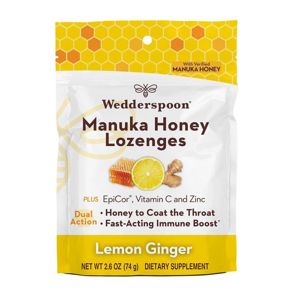 Effectively Soothing Experience unparalleled relief with Wedderspoon's Manuka Honey Lozenges. Infused with the natural healing properties of Manuka honey, these lozenges are designed to soothe sore throats and coughs effectively. The addition of clinically researched postbiotic Epicor® ensures a rapid immune boost within just two hours, providing fast-acting relief when you need it most. Wellness Benefits Elevate your daily wellness routine with a powerful blend of Vitamin C, Zinc, and postbiotic Epicor®. These key ingredients work together to support and strengthen your immune system, making Wedderspoon's Manuka Honey Lozenges not just a remedy, but a delightful daily ritual for continued health and vitality. Delicious and Convenient Enjoy the rich, soothing flavors of Elderberry, and Lemon Ginger. These lozenges are not only effective but also delicious, making them a pleasant way to relieve cough and cold symptoms or simply enjoy every day. Plus, the unique packaging allows the bag to stand on a shelf or be pegged. Manuka Honey Manuka honey is renowned for its natural antibacterial and anti-inflammatory properties, making it effective in soothing sore throats. It also supports digestive health by balancing gut bacteria. Additionally, its high antioxidant content helps protect cells from damage and boosts overall immunity. Postbiotic Epicor® Epicor® boosts antibodies in mucous membranes, trapping bacteria to prevent infections. Within two hours, it increases antioxidant protection, helping your immune system function more efficiently. Additionally, EpiCor® enhances Natural Killer Cell activity, effectively destroying infected cells. Vitamin C & Zinc Vitamin C and zinc are essential for a robust immune system. Vitamin C boosts the production of white blood cells, which are vital for fighting infections, while zinc supports the development and function of immune cells. Together, they enhance your body's ability to ward off illnesses and recover more quickly.